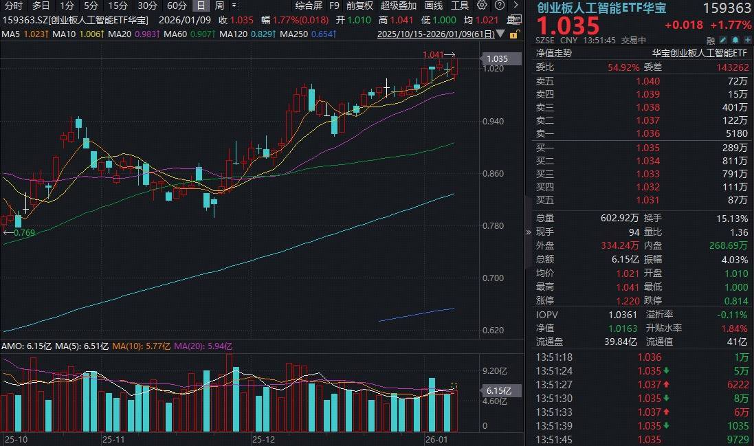 1月9日盘中,AI应用大举爆发,创业板人工智能午后再创新高!其中,易点天下20CM涨停,昆仑万维、润泽科技、蓝色光标等多股涨超12%,奥飞数据、万兴科技、航宇微、拓尔思、汉得信息等多股涨超6%。热门ETF方面,流动性突出的创业板人工智能ETF(159363)场内冲高逾2%再创上市新高智赢策略,放量成交超6亿元!