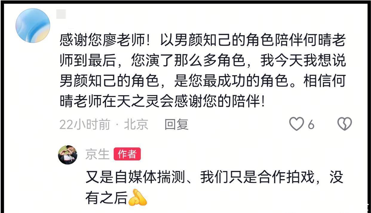 到了12月15日凌晨,对于不离不弃照顾何晴10年的传闻,廖京生进行了回应。彼时有网友留言感谢廖京生,感谢他以男颜知己的身份陪伴何晴到最后,还说廖京生演了那么多角色,红颜知己是他最成功的角色。看到这条留言,廖京生哭笑不得,他回复了这位网友,他写道:又是自媒体揣测,我们只是合作拍戏,没有之后。