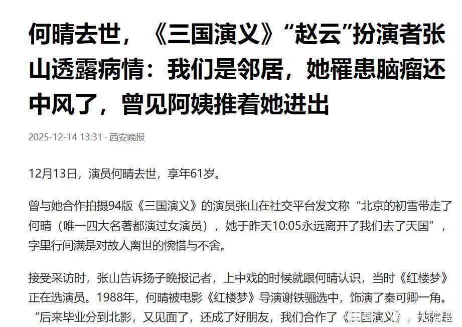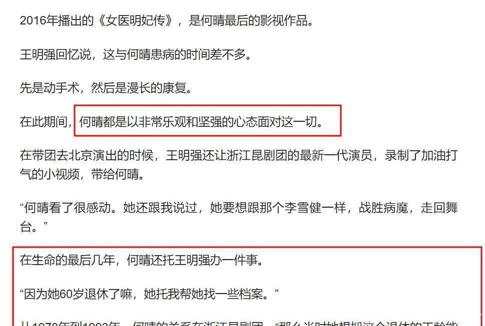 谁能想到,这么优秀的演员会在61岁的年纪猝然离世。据了解,何晴的父母都因脑溢血去世,而她在2015年确诊了脑瘤。在10年与病魔抗争的日子里,何晴做了开颅手术,语言能力受到影响。并且她还不幸中风了,近几年只能靠着保姆推着轮椅出行。