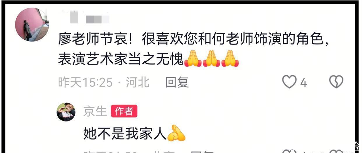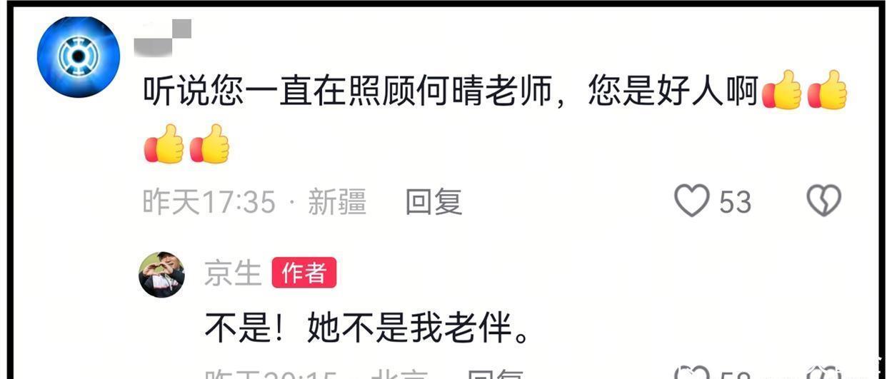 然而,这是假的,是编造的。对于和何晴是夫妻的谣言,以及照顾何晴10年的传言,廖京生分2次进行了回应。在何晴离世的消息刚爆出来时,一众网友涌入何晴的账号评论区留言安慰。廖京生回应称何晴不是他的老伴,不是他的家人。