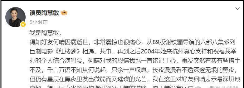 遗憾的是金牛在线,何晴还是不幸离世了。在何晴离世后,六小龄童、陶慧敏、张纪中等人纷纷发文悼念。